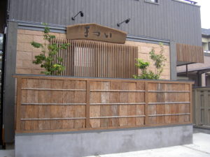 静岡市の和風居酒屋「旬香 まつい」様。2階は住居になっています。暗いときにも「住居らしさ」を出さないよう、2階の住居は黒く塗装しました。1階のお店部分は日本の庭園をイメージし、入り口には木材を使用しています。