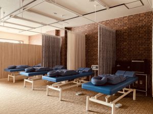 整骨院といえば、施術台ごとに目隠し用のカーテンを設けているのが一般的なイメージ。あえて、これを外してしまうことで、開放感を作り出す演出も選択肢です。