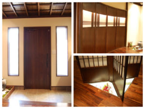 木材テイストの内装に合わせた、濃いブラウンが特徴です。シンプルなデザインですが、両サイドにある縦長の窓とも相まって、存在感のあるドアに仕上げました。
