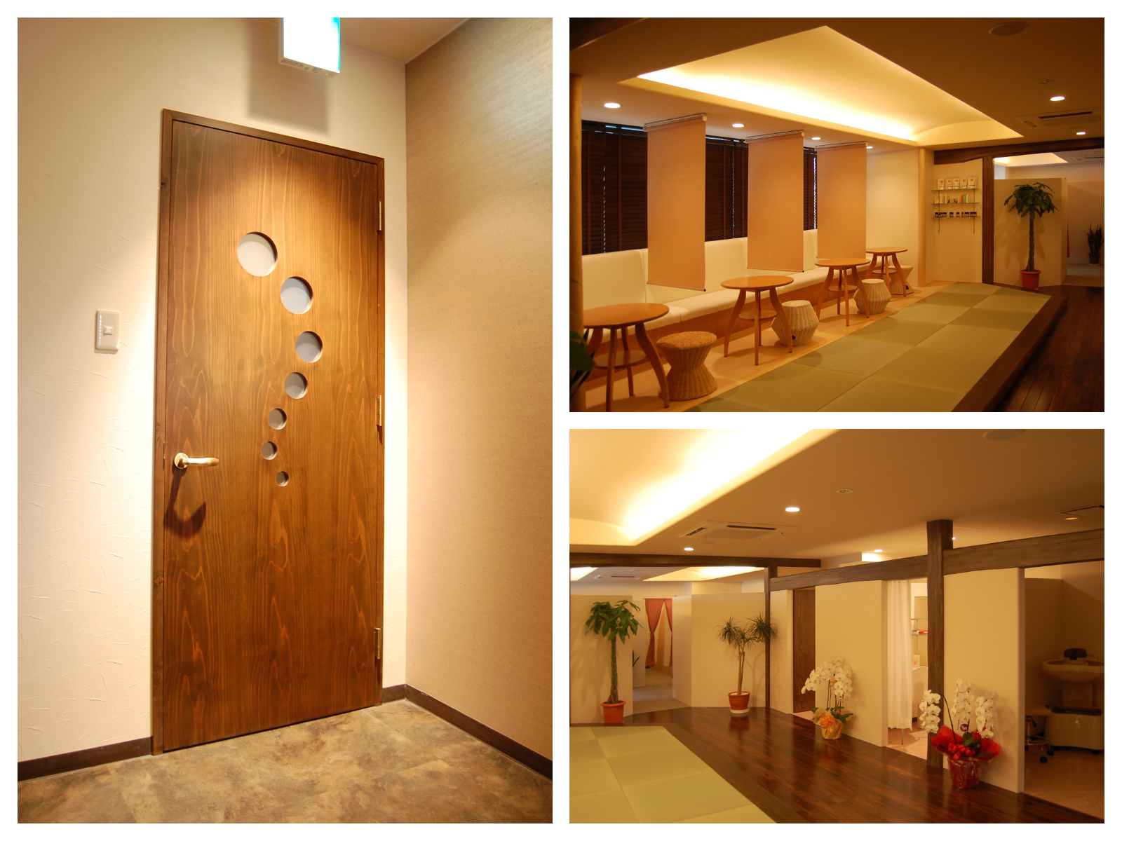 こちらは静岡市葵区のビューティーサロン「LAGE 静岡呉服町店」様の内装とドアです。畳や木材がメインの和風な店舗内装に合わせ、店内のドアも木のぬくもりを感じさせるデザインにしました。