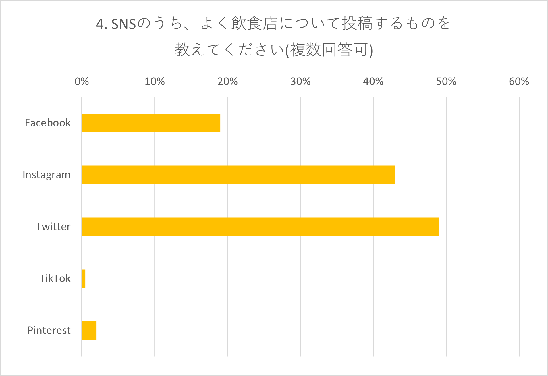 ちなみに、店舗の内外装に限らず、メニューを含めて飲食店について何らかの投稿をする際に利用するSNSは、最も多いのが「Twitter」で約半数、次いで「Instagram」が約4割でした。