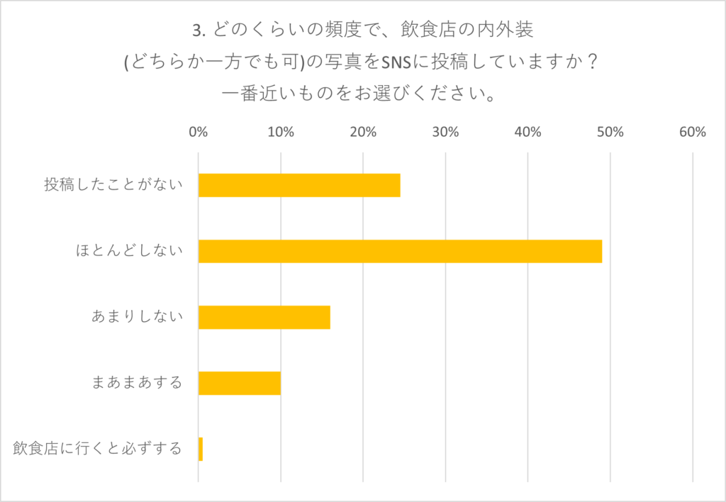 約7割の人が、飲食店の内装または外装の写真をSNSに投稿することについて、「ほとんどしない」、または「投稿したことがない」と答えました。