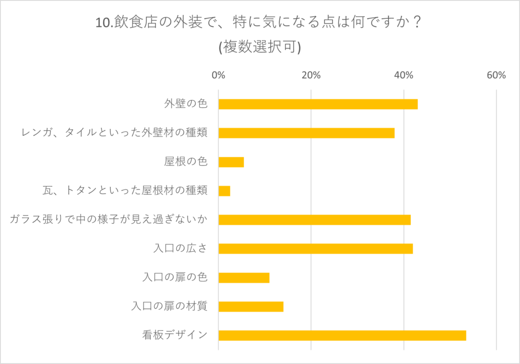 「看板デザイン」が約半数と最も多く、次いで「外壁の色」「入口の広さ」「ガラス張りで中の様子が見え過ぎないか」が約4割と続きました。