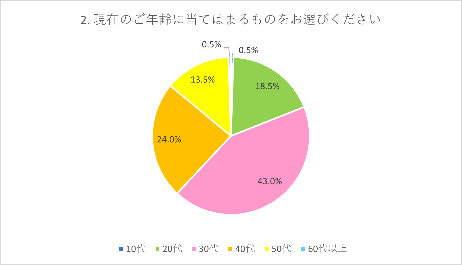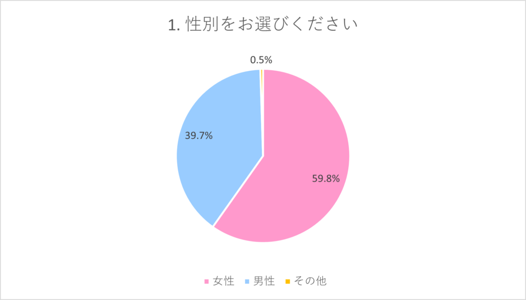 回答者の性別は女性が約6割、男性が約4割でした。年齢は30代の方が約4割と最も多く、次いで40代の方が約2割という結果になりました。