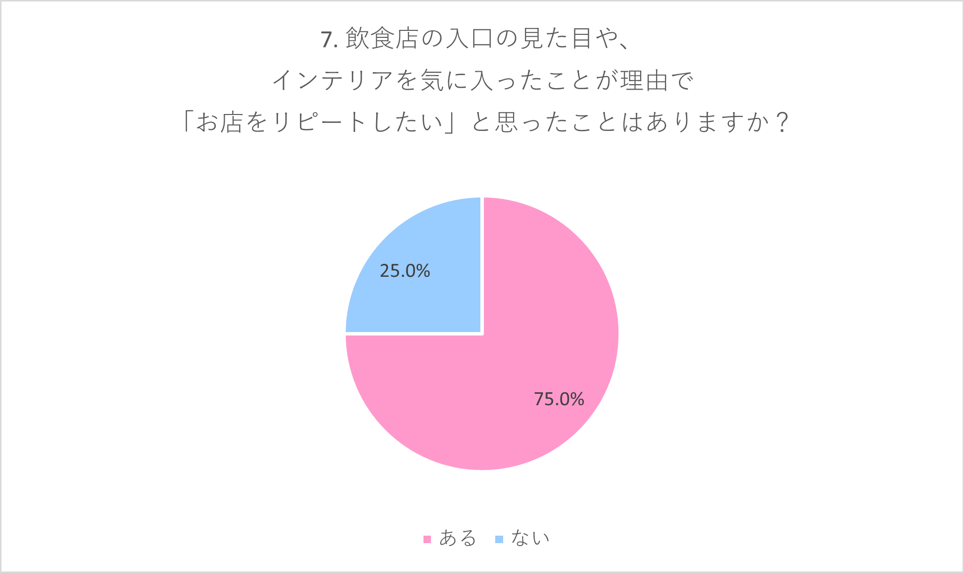 飲食店の入口の見た目やインテリアを気に入ったことで、8割近くの方が「お店をリピートしたい」と思ったことがあることがわかりました。店舗デザインは飲食店のリピートにも影響を及ぼすといえます。