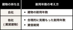賃貸など、建物の名義が他社・他人の場合、合理的に見積もった耐用年数、または賃借期間が耐用年数として適用されます。