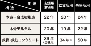 建物の耐用年数は構造と用途によって違いがあります。主な用途として挙げられる、「店舗・住宅」「飲食店」「事務所」の構造ごとの耐用年数は以下のとおりです。
