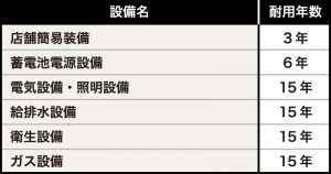 店舗に設置する器具や備品にも、それぞれ耐用年数が設定されています。たとえば主に飲食店が導入する備品の耐用年数は以下のとおりです。