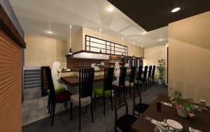 「お客様の要望になるべく応えたい」というオーナー様の想いを実現すべく、どの席でもお客様とのコミュニケーションがとれるよう、オープンキッチンを設置しています。