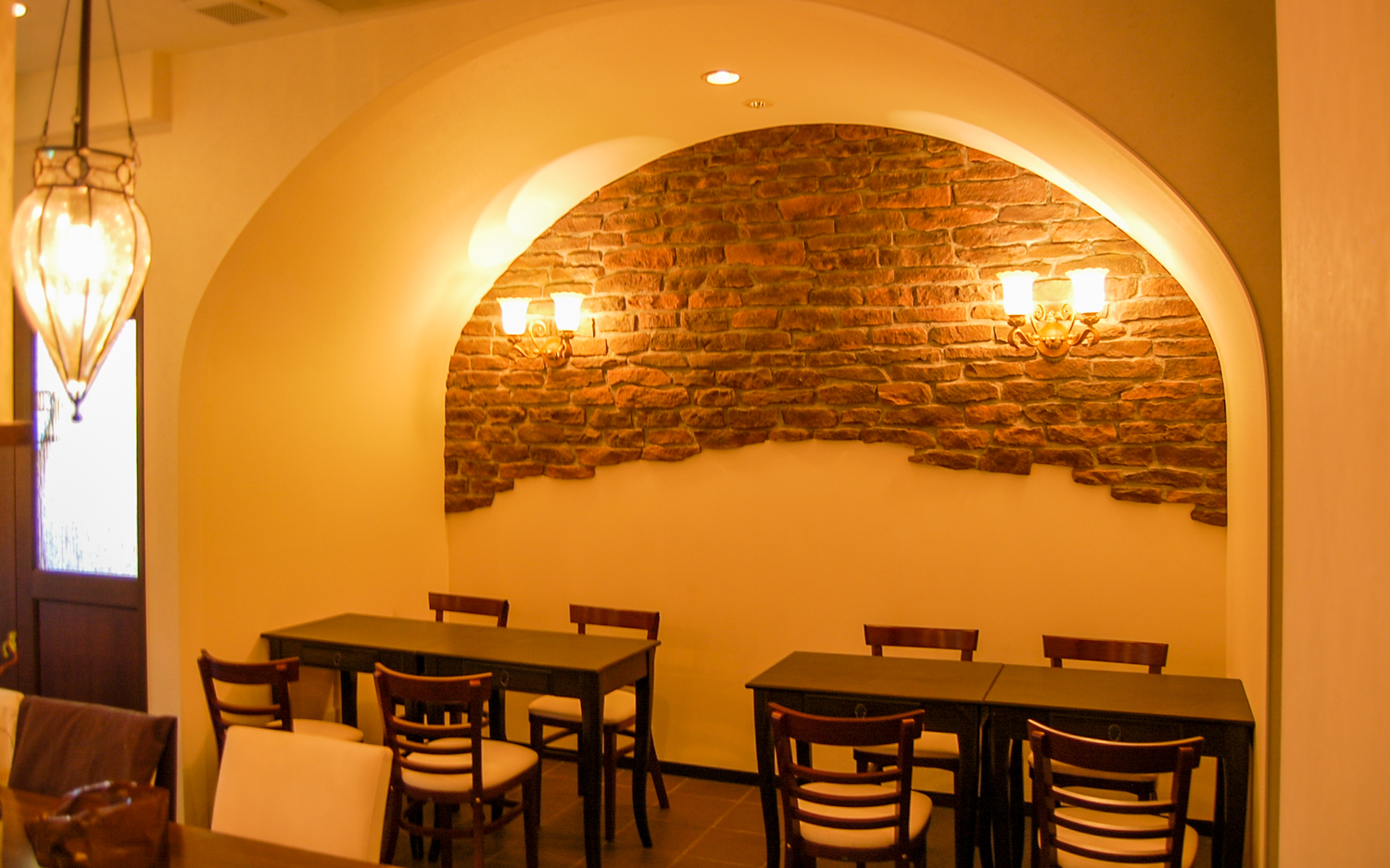 テーブル席がある壁にはレンガを詰めて、西欧らしさを演出。