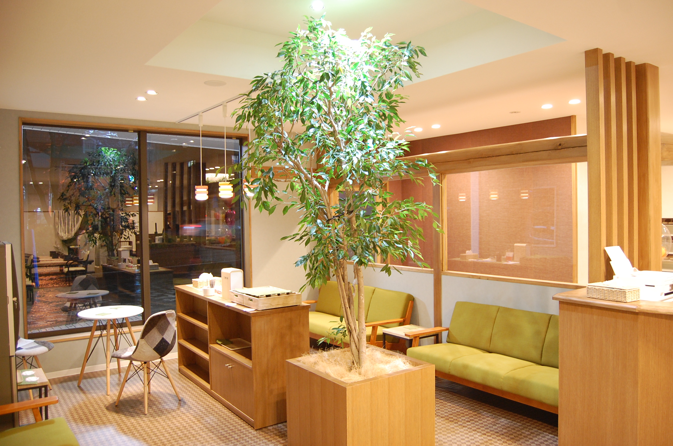 さらに、「地域の人たちが集まって話すような場所にしたい」というオーナー様の想いを実現した、カフェスペース付近には大きな観葉植物も配置したことで、温かみのある雰囲気に仕上げました。