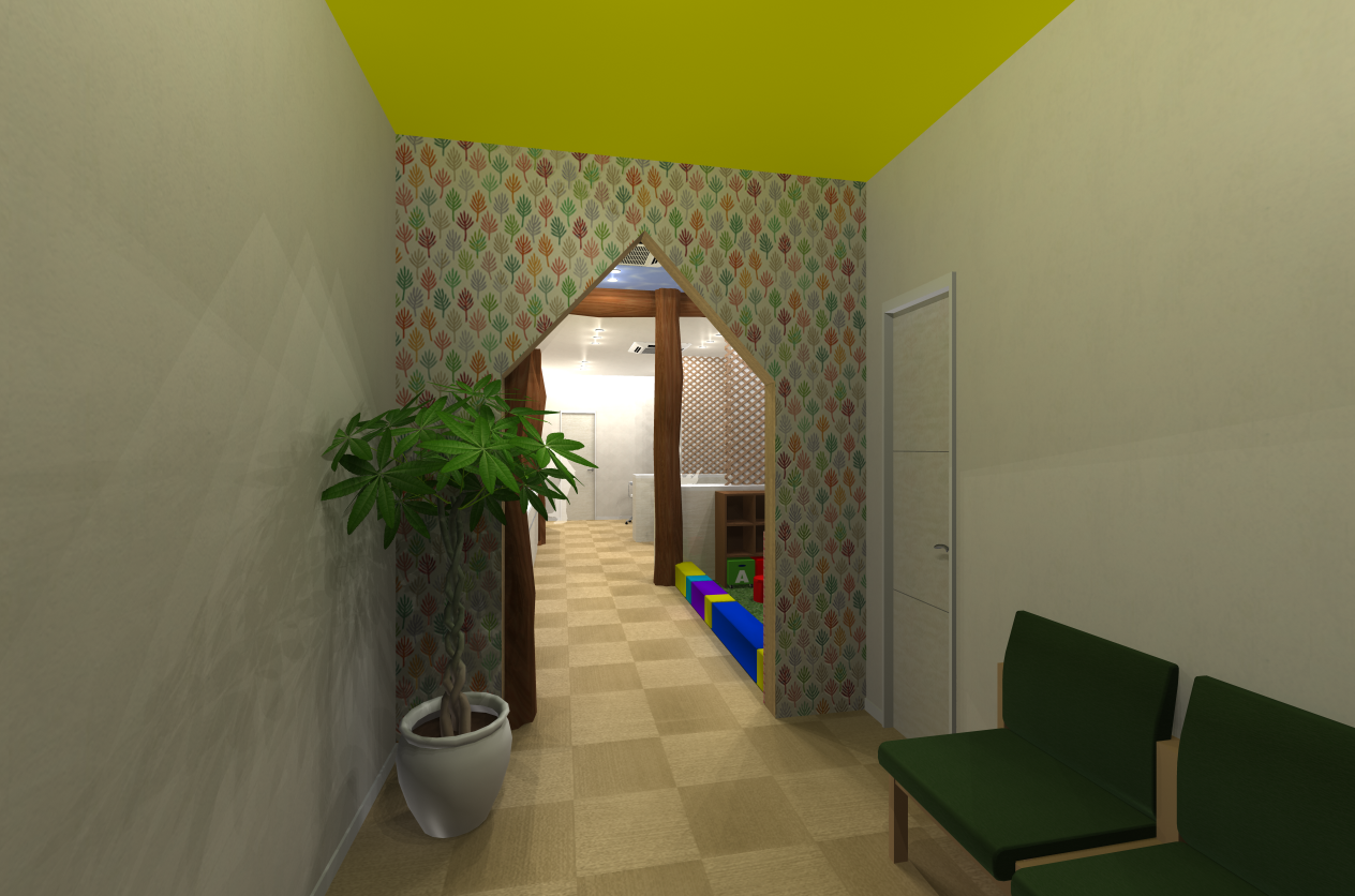 玄関ドアを開けた瞬間目に映るアングルで、待合スペースにもなっております。三角形のゲートや可愛らしい壁紙でキッズの要素を取り入れ、ワクワク感を与えるデザインを演出しています。