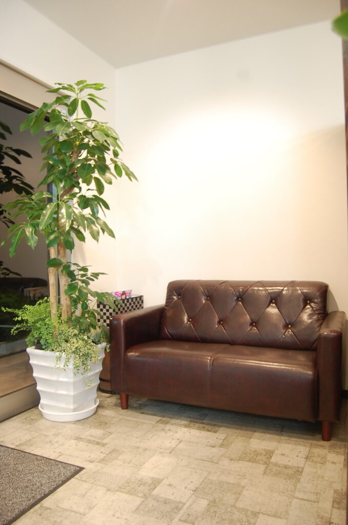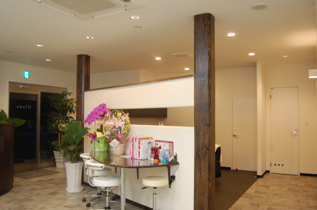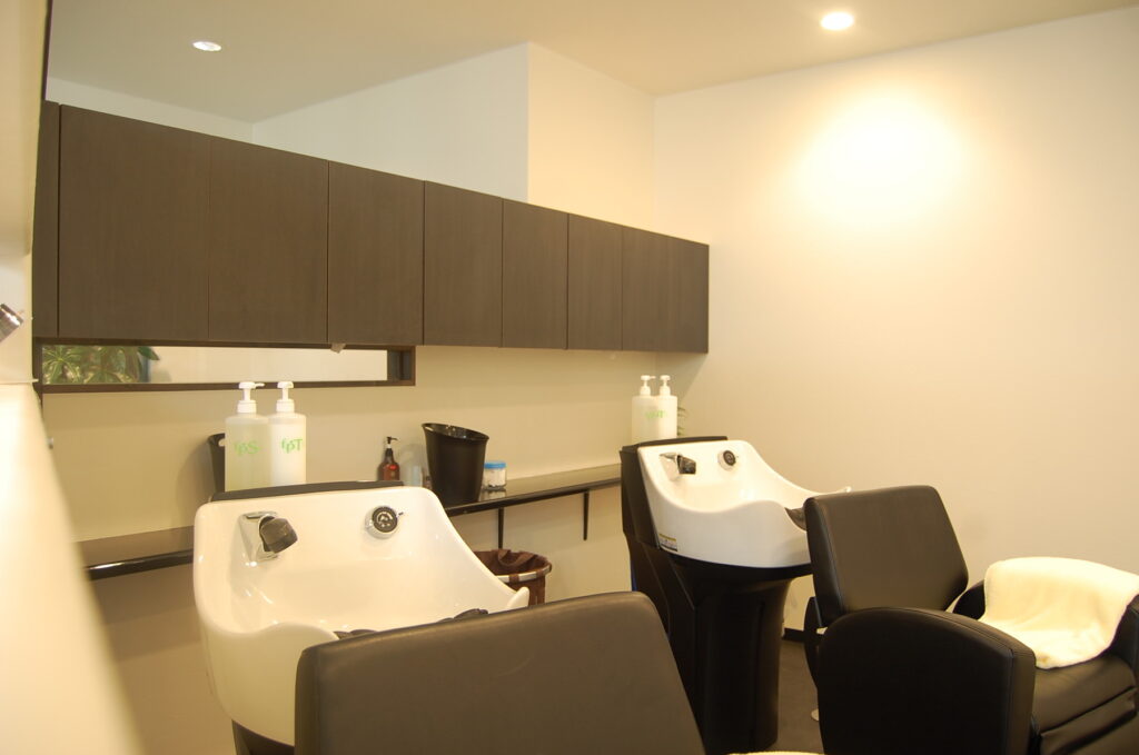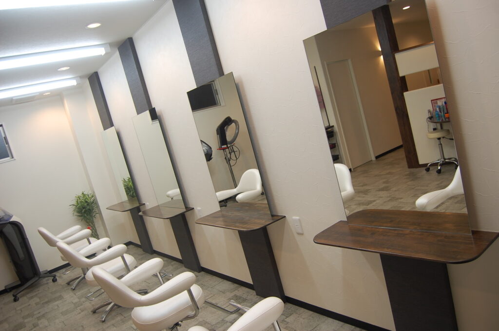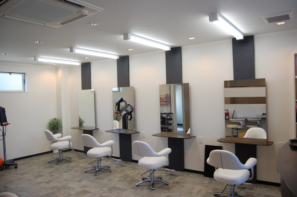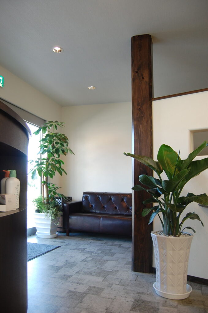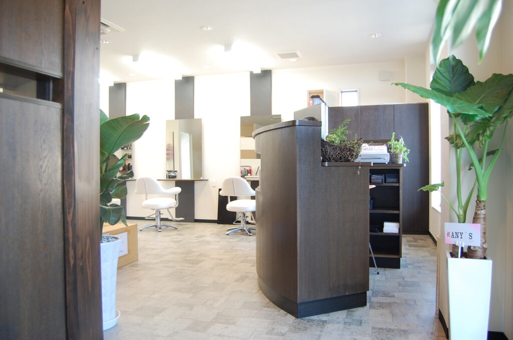 店内の照明は、業務上どうしても蛍光色となってしまう美容院ですが、サロンのカウンターや受付家具などに自然木を使用し、ちょっと濃いめのブラウンに仕上げ、観葉植物の緑と合わせることで温かみのあるサロンをつくることができた。