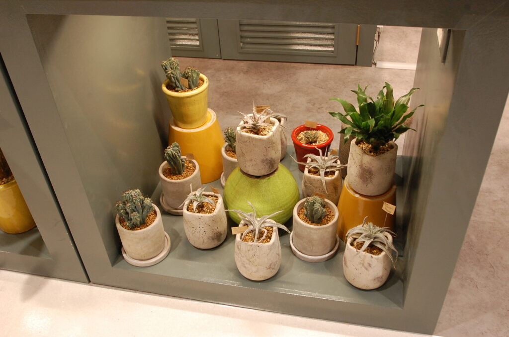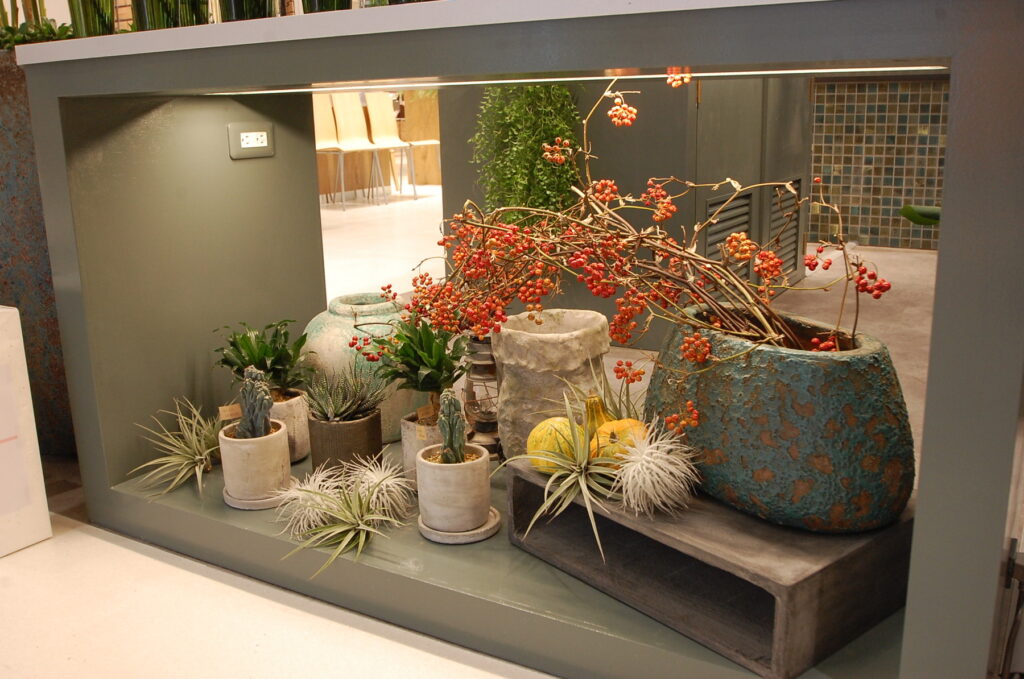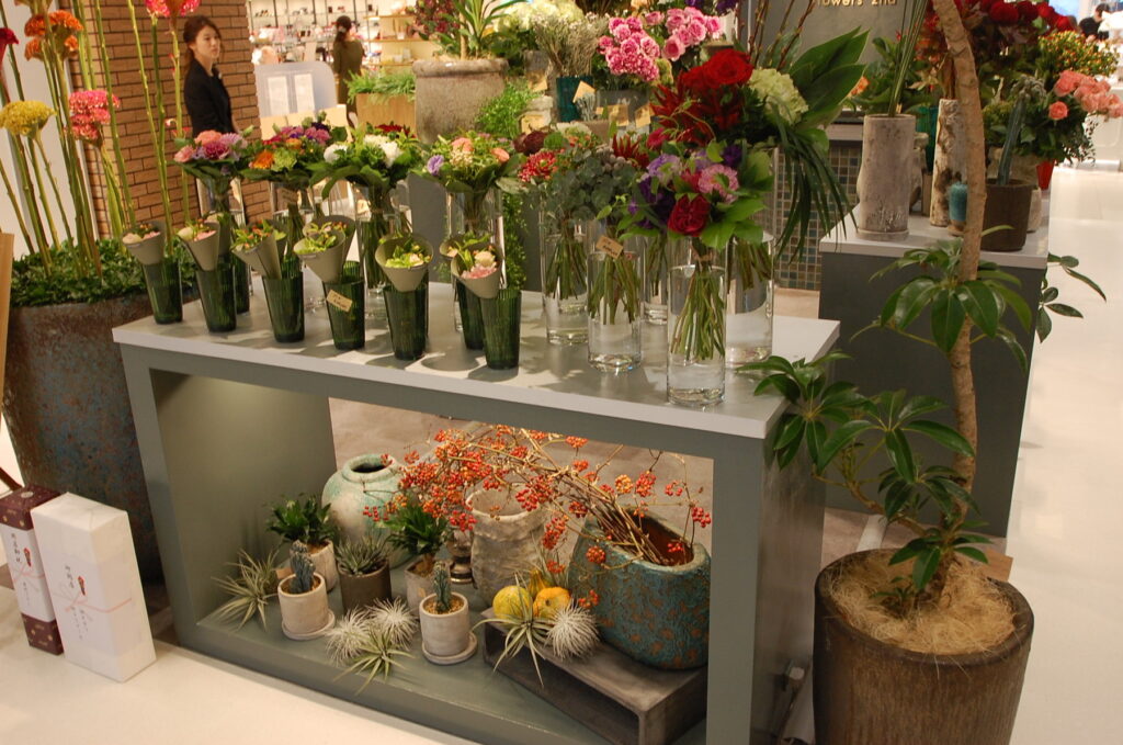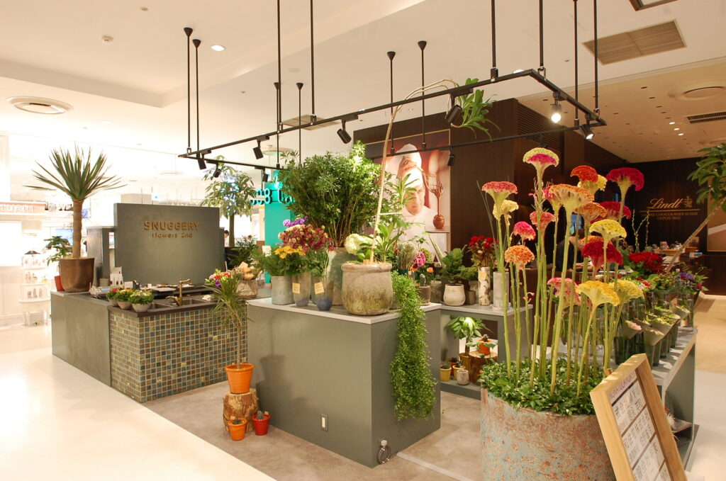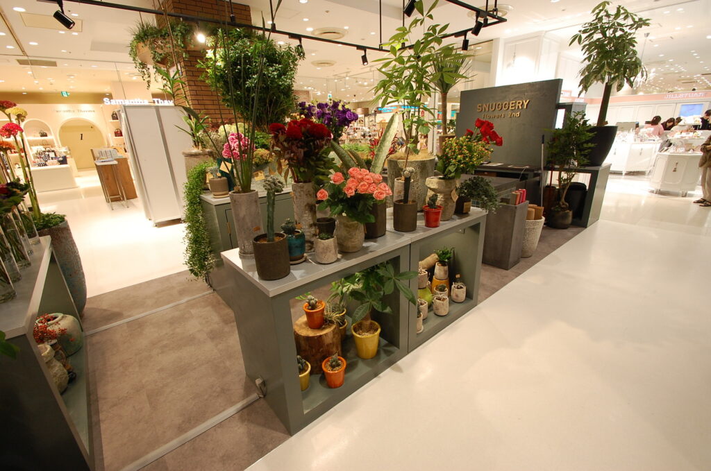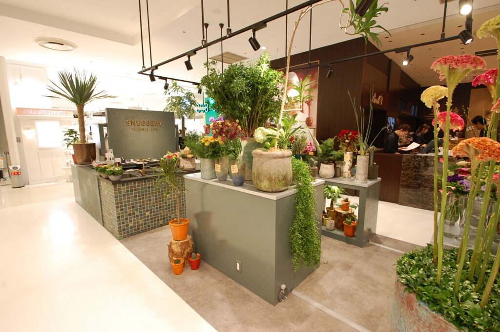 ショッピングモールの島部分のエリアということで、どの角度からも見せ場となります。家具の高さや大きさ、全体的な色合いと植栽の配置バランスも絶妙で、お店の存在感も出て非常にイイ空間に仕上がりました。